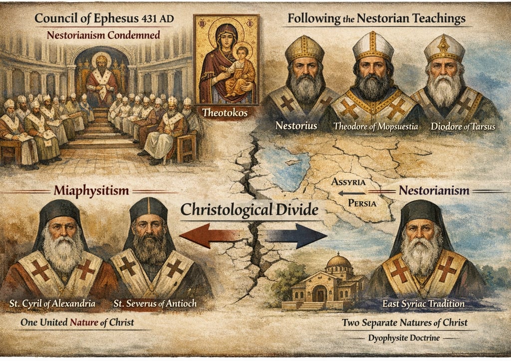 ഈ മൂന്നു പേരും ആരാണ്? ഇവരുടെ മൂന്നിന്റെയും ജോയിന്റ് എഫോർട്ടാണ് നെസ്റ്റോറിയനിസം. അപ്പോൾ “ഞങ്ങൾ അത്ര നെസ്റ്റോറിസം ഒന്നുമില്ല” എന്ന് പറയുമ്പോഴും, കത്തോലിക്ക സഭ എഡി 431-ലെ എഫേസോസ് സുന്നോധോസ് — പൊതു സുന്നോധോസ് — അതിനെ അംഗീകരിക്കുന്നതാണ് റോമൻ കത്തോലിക്ക സഭ. എഡി 431-ലെ സുന്നഹദോസ് അംഗീകരിക്കുന്നതാണ്. പക്ഷേ കത്തോലിക്ക സഭയ്ക്ക് ഉള്ളൊരു പ്രശ്നം എന്താണെന്ന് വെച്ചാൽ, കത്തോലിക്ക സഭയുടെ എക്ലീഷിയാസ്റ്റിക്കൽ നിലപാട് അനുസരിച്ച് ഒരു പൊതു സുന്നഹദോസിന്റെ തീരുമാനം കത്തോലിക്ക സഭയ്ക്ക് ബൈൻഡിങ് ആയിരിക്കും, എന്നും ബൈൻഡിങ് ആണ്; അത് ഒരിക്കലും മാറ്റാൻ പറ്റത്തില്ല. അതേസമയം തന്നെ ഇവർക്ക് നെസ്തോറിനെ എടുക്കുകയും വേണം. കത്തോലിക്ക സഭയുടെ എക്ലീഷിയോളജിയിൽ ഒരു എക്യുമനിക്കൽ കൗൺസിലിന്റെ ഡോക്ട്രിനൽ ഡിസിഷൻസിനെ റിവേഴ്സ് ചെയ്യാൻ പറ്റത്തില്ല — നോട്ട് റിവേഴ്സിബിൾ. അതുകൊണ്ടാണ് അവർ 431-ലെ ഡോക്ട്രിനൽ ഡിസിഷൻ അക്സെപ്റ്റ് ചെയ്യുന്നത്; അത് ബൈൻഡിങ് ആണ്.
